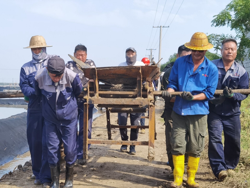 養(yǎng)殖池邊,工作人員仔細的對河道清淤進行現(xiàn)場勘查,確保排水通暢。